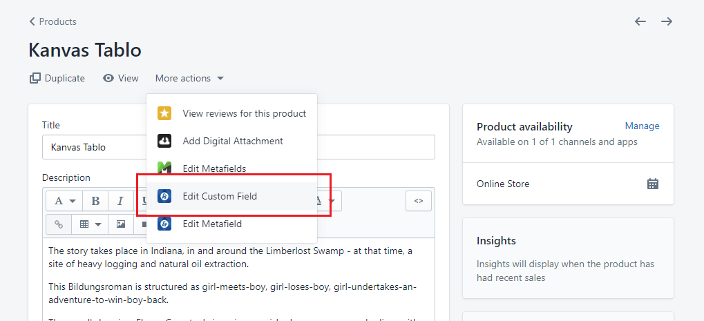 For File Size, Edition Language, Book Format, Date Published, click More actions dropdown under the bolded Product title and choose Edit Custom Field.