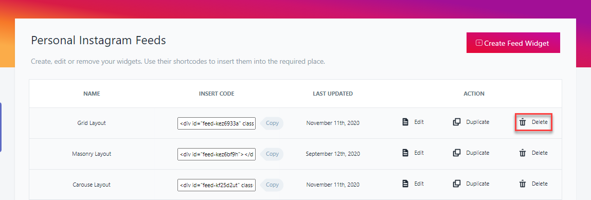 - In the Widget list, click the Delete button of the feed you want to remove.