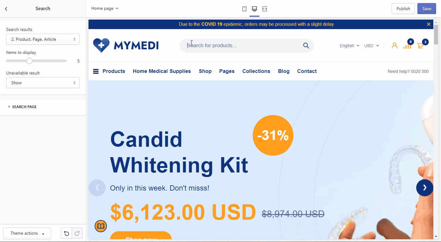 - Product, Page, Article, Collection: Products, pages, articles, collections which match your key words will appear.
