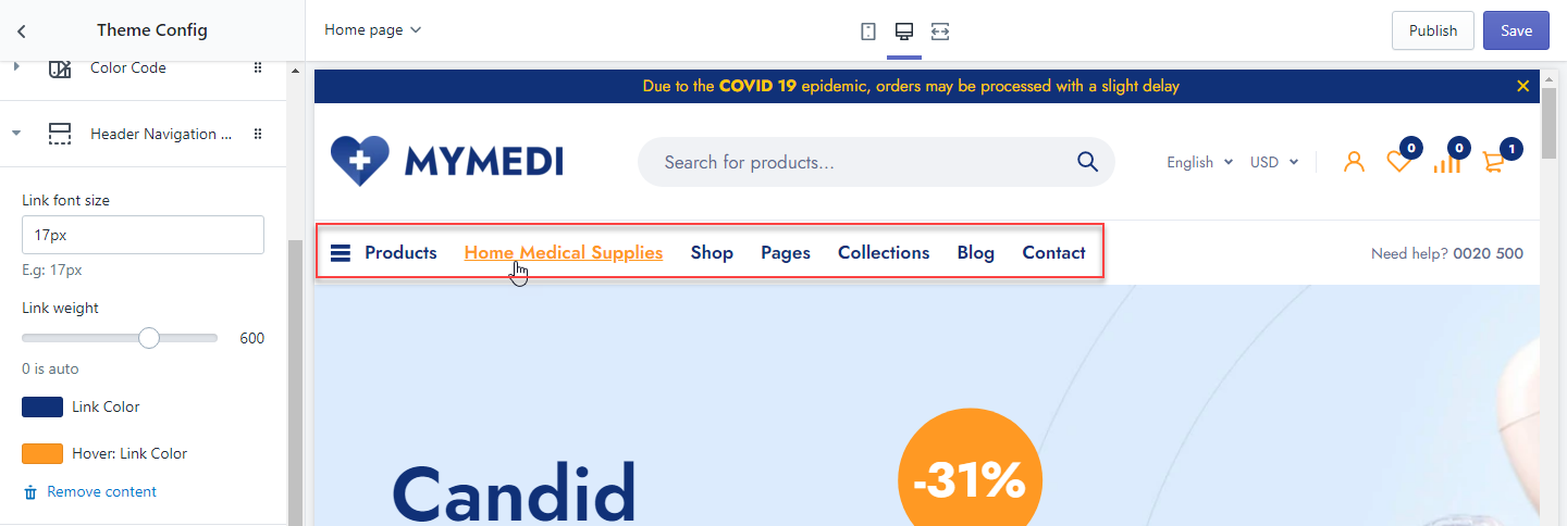 Theme Config is a static section which will affect all pages. To turn on/off the section, please go to Theme settings > General settings.