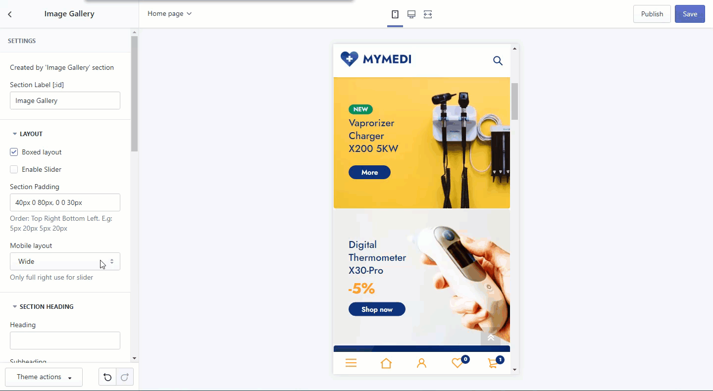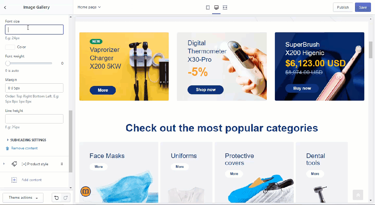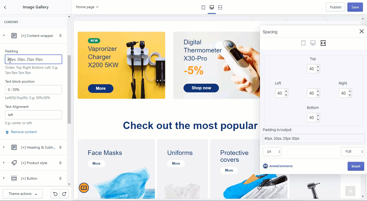 - To adjust the space between 2 items, insert values to the Item spacing field. It's possible to set different spacing for tablet and mobile devices.