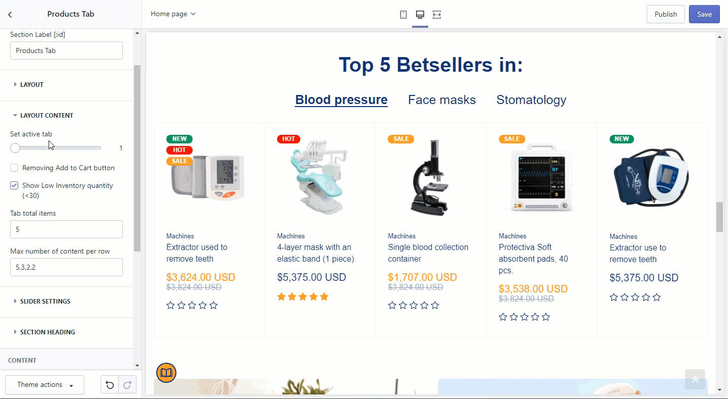 - Show low Inventory quantity (<30): When a product reaches is low in stock, a notice will appear on product card.