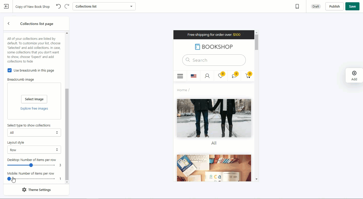 - Unlike on other pages, Number of items per row/page can only be set for desktop.
