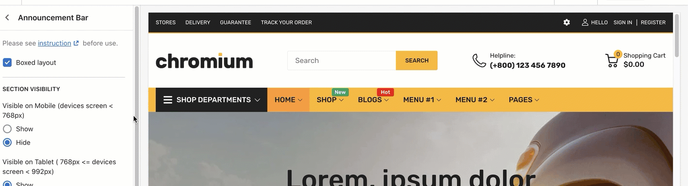 - Section visibility: You can choose to Hide or Show the announcement bar on specific devices