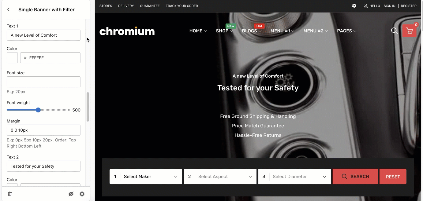 Font size: The font-size property sets the size of a font, enter the font size into the boxes for the Text 1,Text 2. Eg: 56px,36px,24px corresponding with the Desktop, Tablet, Mobile.