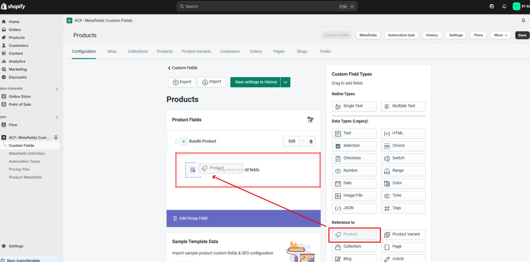 Open the ACF: Metafields Custom Fields app, go to Product and choose the product you want to add the countdown timer