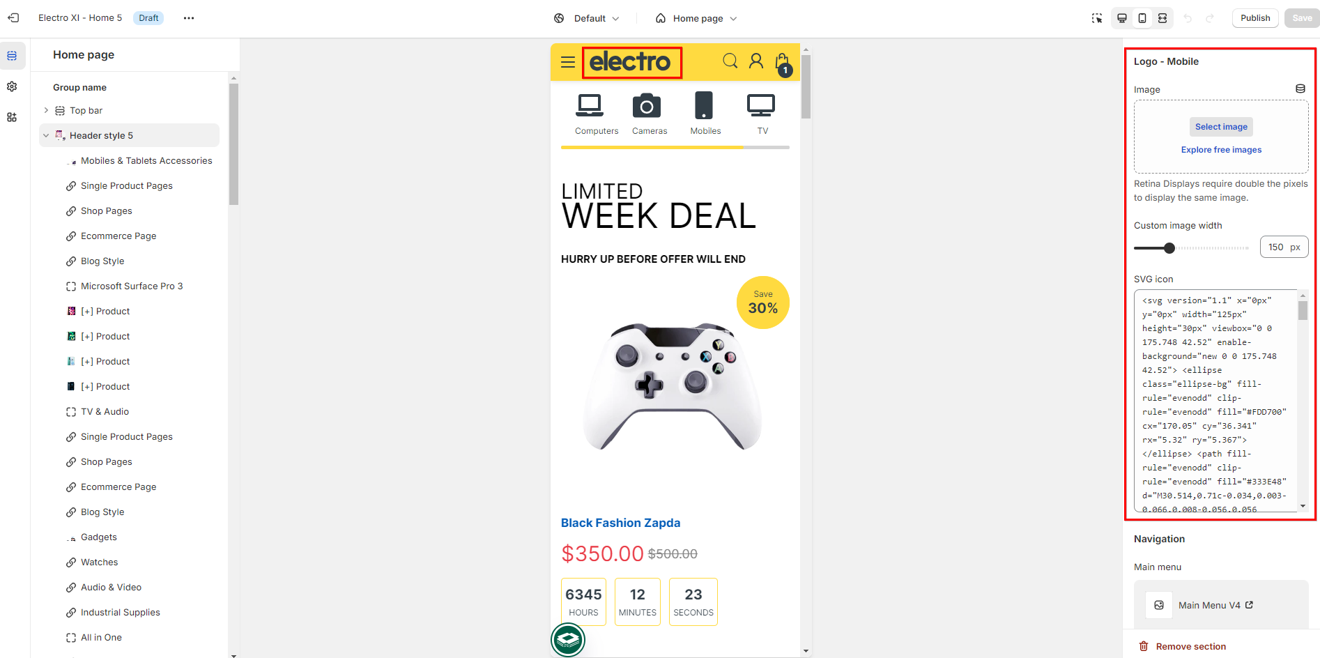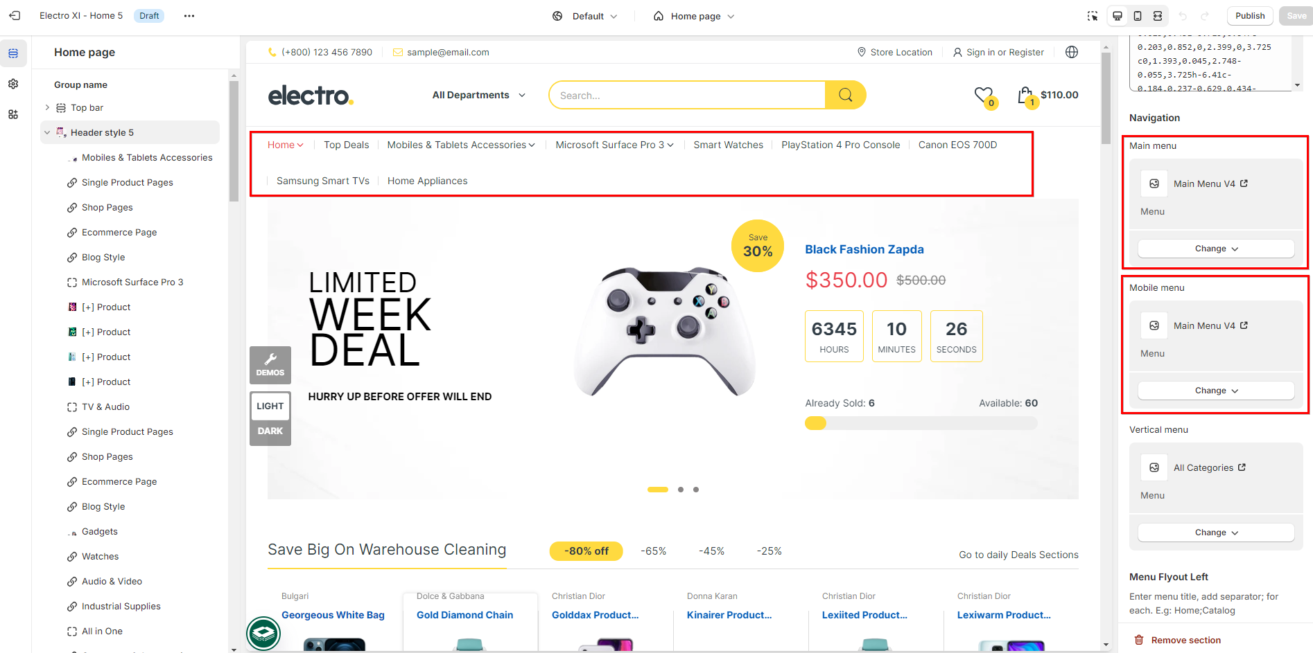 - Main menu: The main menu is usually displayed as items across the width of the header (Horizontal).