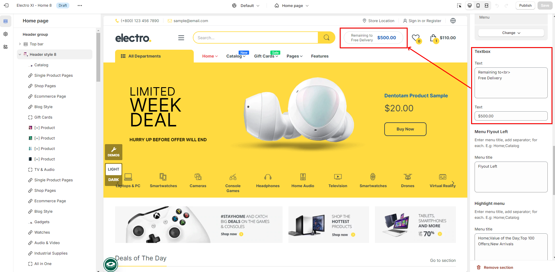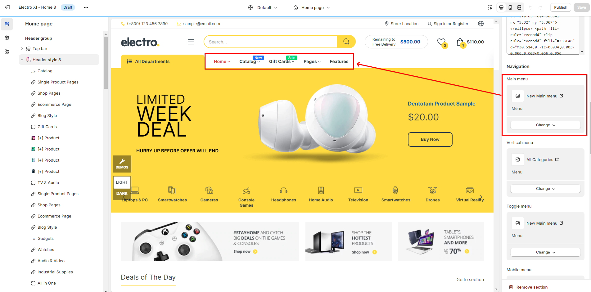 - Main menu: The main menu is usually displayed as items across the width of the header (Horizontal).