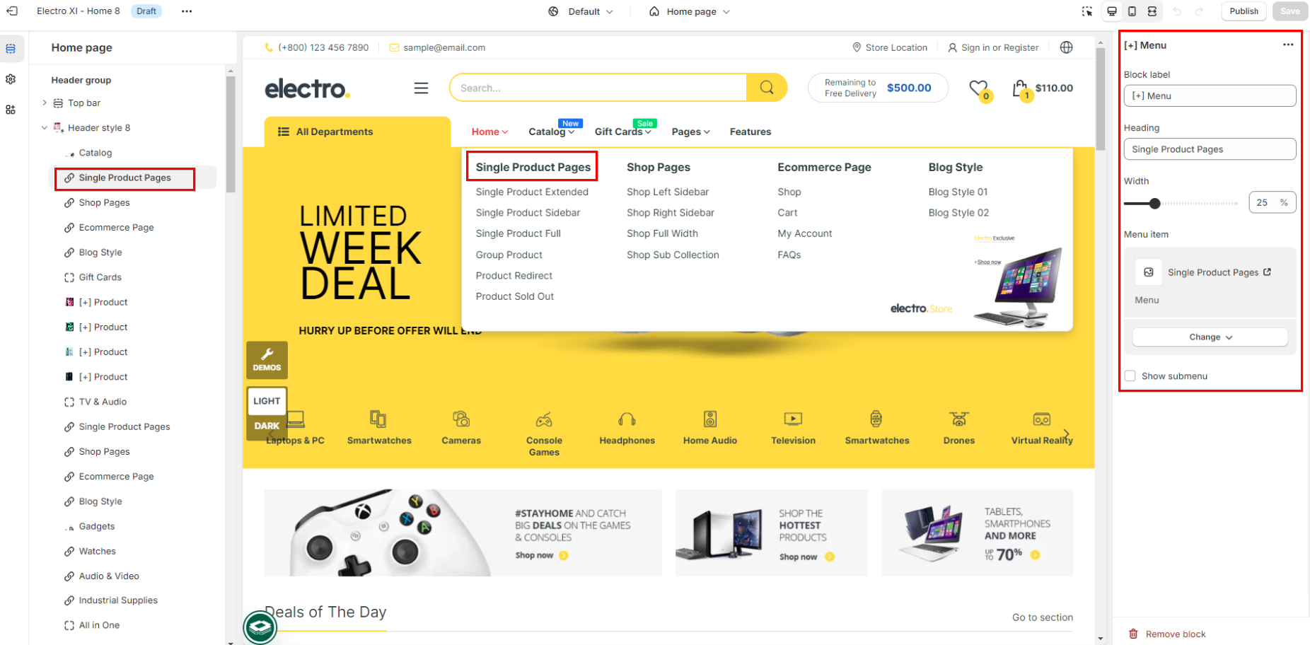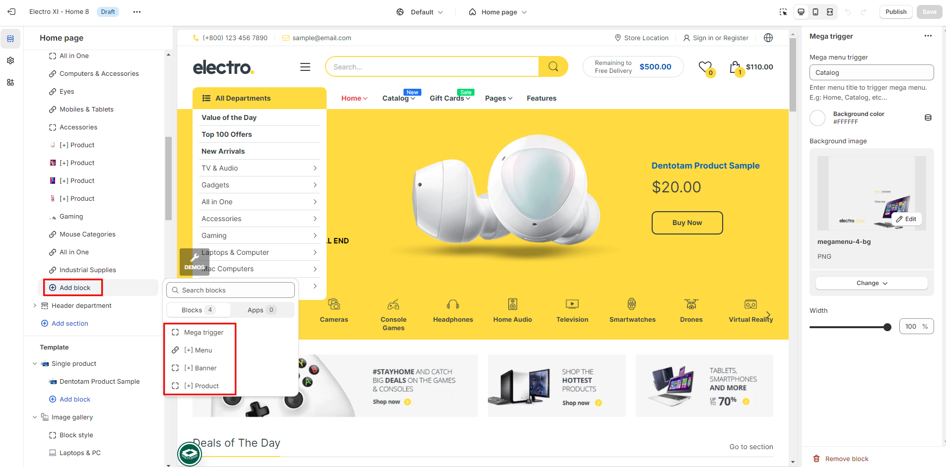 When you want to enable the navigation, you must add the block "mega trigger" first and then leave other blocks under it [+menu], [+banner], [+product]...