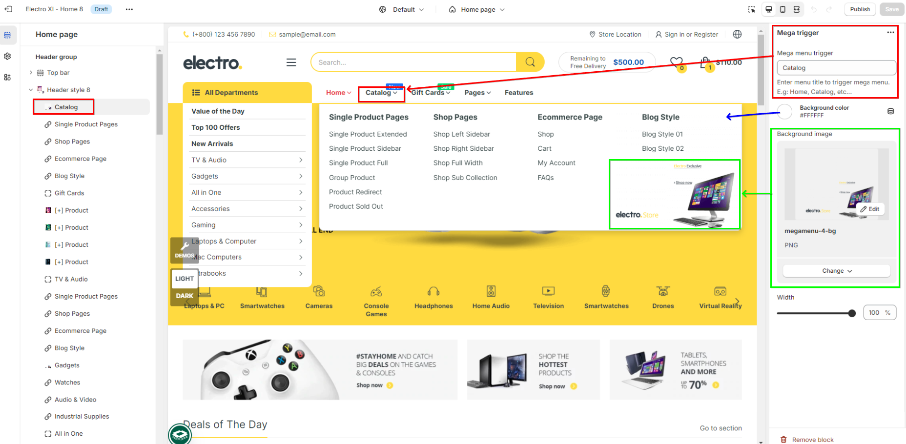 - Please note that the name of Menu item entered in Mega menu trigger field must match the name of one of the first-level menu items.