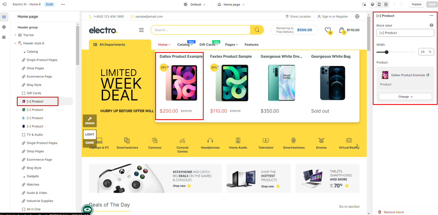 - Product: select the product to display